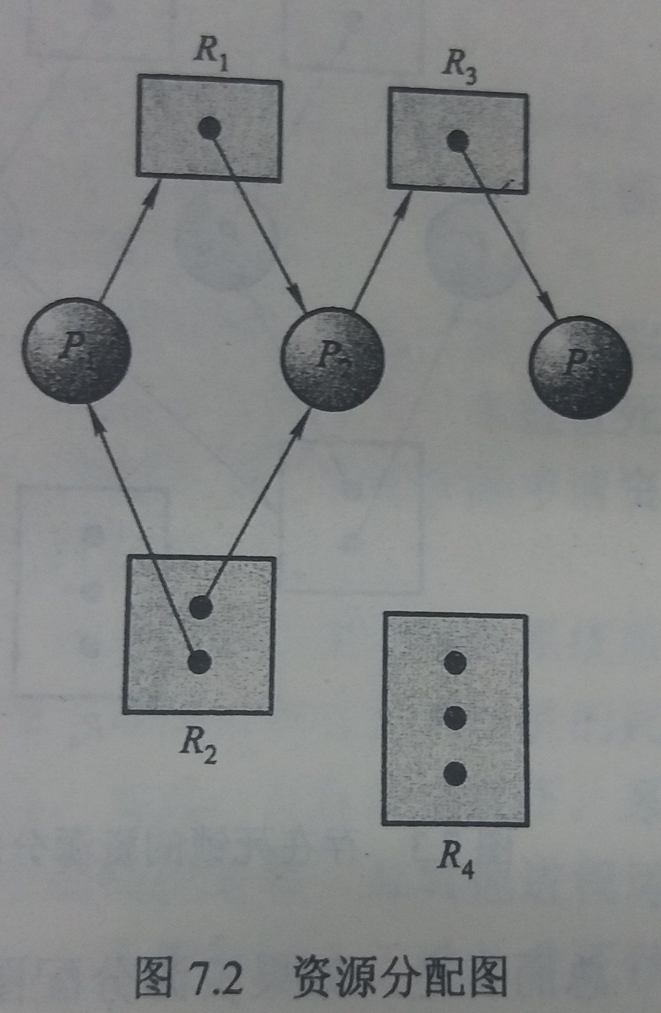 Pi已经申请了资源类型Rj的一个实例,正在等待该资源 - 注意:箭头并不指向资源实例,只指向资源类型